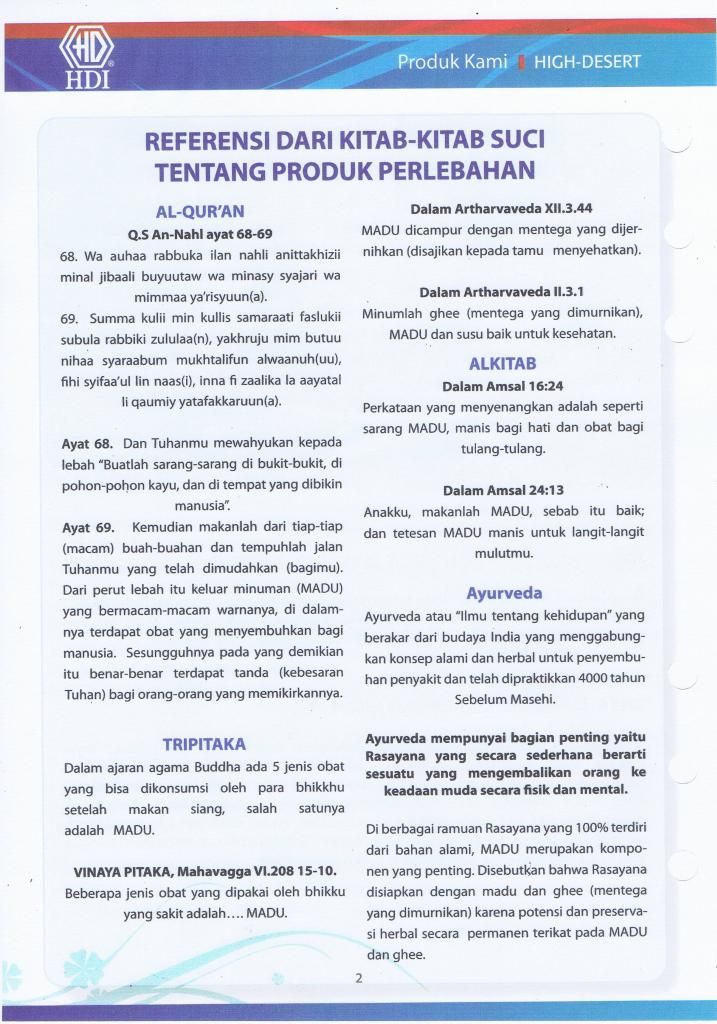 Produk kami berbahan dasar dari Produk Perlebahan (http://www.hdindonesia.com/tentang-lebah), yang sudah teruji sejak ribuan tahun yang lalu, bahkan tertulis di 5 Kitab Suci Agama yang ada di Indonesia, yaitu :